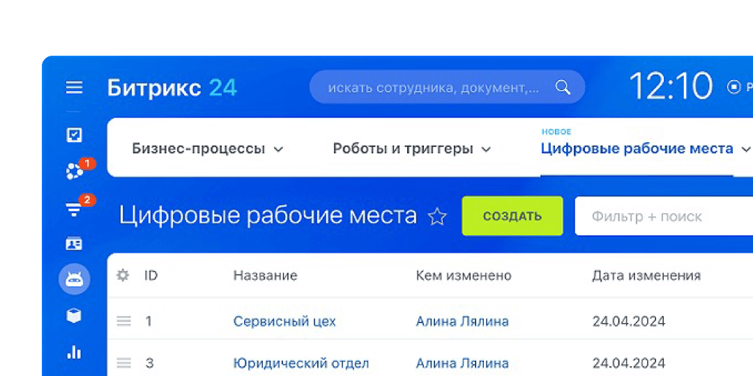 Для любого отдела можно создать личное Цифровое рабочее место с нужными процессами. В каждом процессе — свои карточки, воронки, стадии, роботы автоматизации и другие функции.
