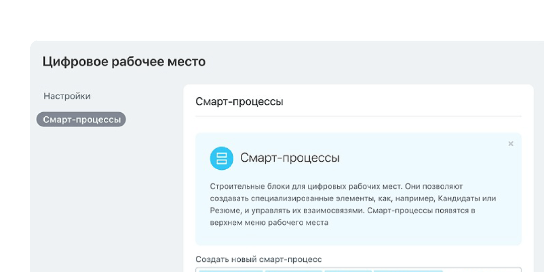 Для любого отдела можно создать своё Цифровое рабочее место с нужными процессами и автоматизацией. Быстро создавайте, настраивайте и дорабатывайте смарт-процессы с помощью no-code инструментов