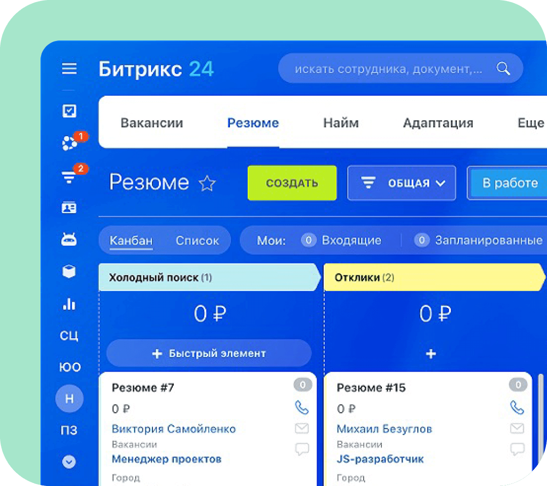 Рутинные операции роботизированы: резюме автоматом попадают в работу, система отправляет рекрутёру отбивки, тут же генерируются нужные документы и отправляются кандидатам.