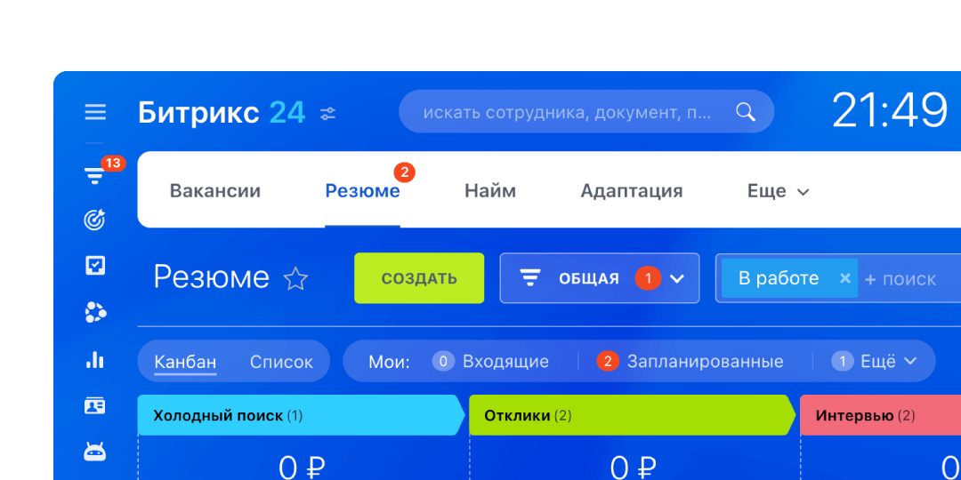Весь процесс найма — от поиска соискателя до его принятия на работу — на одном экране. Всё идёт по заданному алгоритму со своими этапами и заданиями.